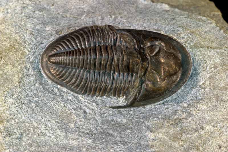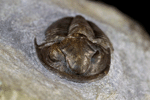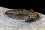 Dechenella verneuili, einer der häufigsten Trilobiten des unteren Givetiums, zumindest als Exuvie. Pygidien, Cranidien und Librigenae kommen in entsprechenden Schichten des unteren Givetiums teilweise massenhaft vergesellschaftet mit Nyterops nyter vor. Hier gilt das schon bei Nyterops nyter erwähnte: Exuvien sind häufig, vollständige Exemplare sehr selten. Selbst ein vollständiges Cepahlon einer Dechenella ist schon ähnlich rar wie ein kompletter Panzer. Gestrecktes Exemplar, Länge 2,5cm.