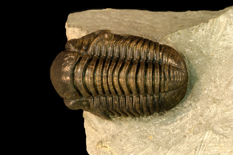 Hier sehen wir den zweithäufigsten Trilobiten aus dem "Geeser Horizont" der Gerolsteiner Mulde. In der Mehrzahl fand man die Proetiden, wie die Phacopiden halb oder ganz eingerollt. Die schöne "holzartige" Maserung der Schalensubstanz zeigt sich nur bei Trilobiten weniger ganz bestimmter Kalkbänke eines eng definierten Profilabschnittes. Ein fast gestrecktes Exemplar mit einer Länge von knapp 3 cm.